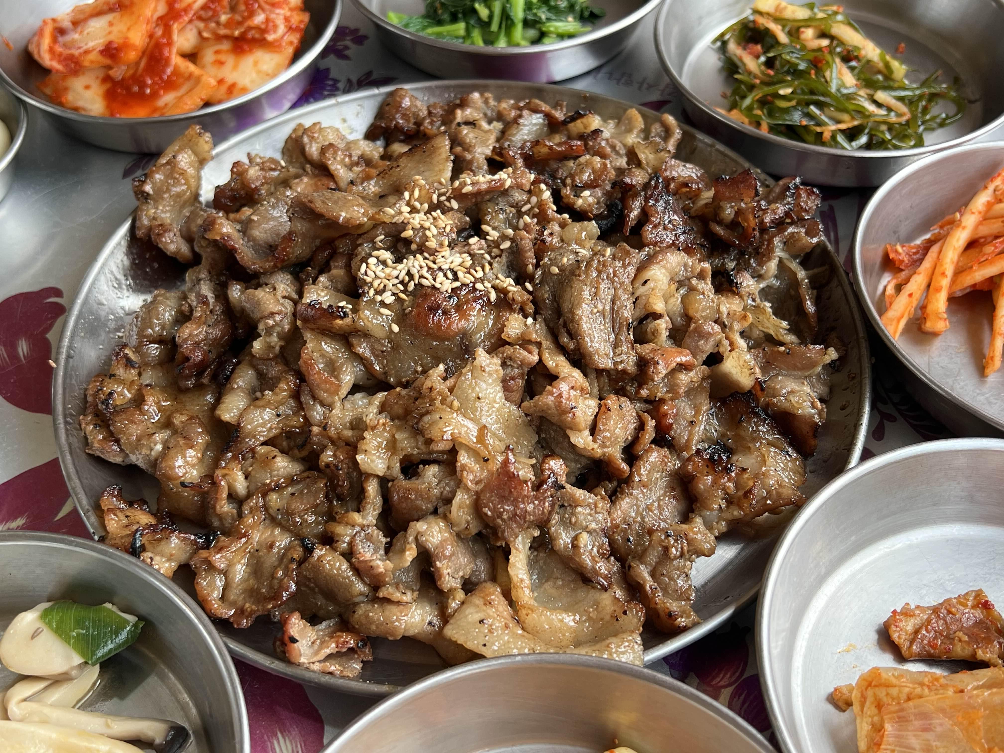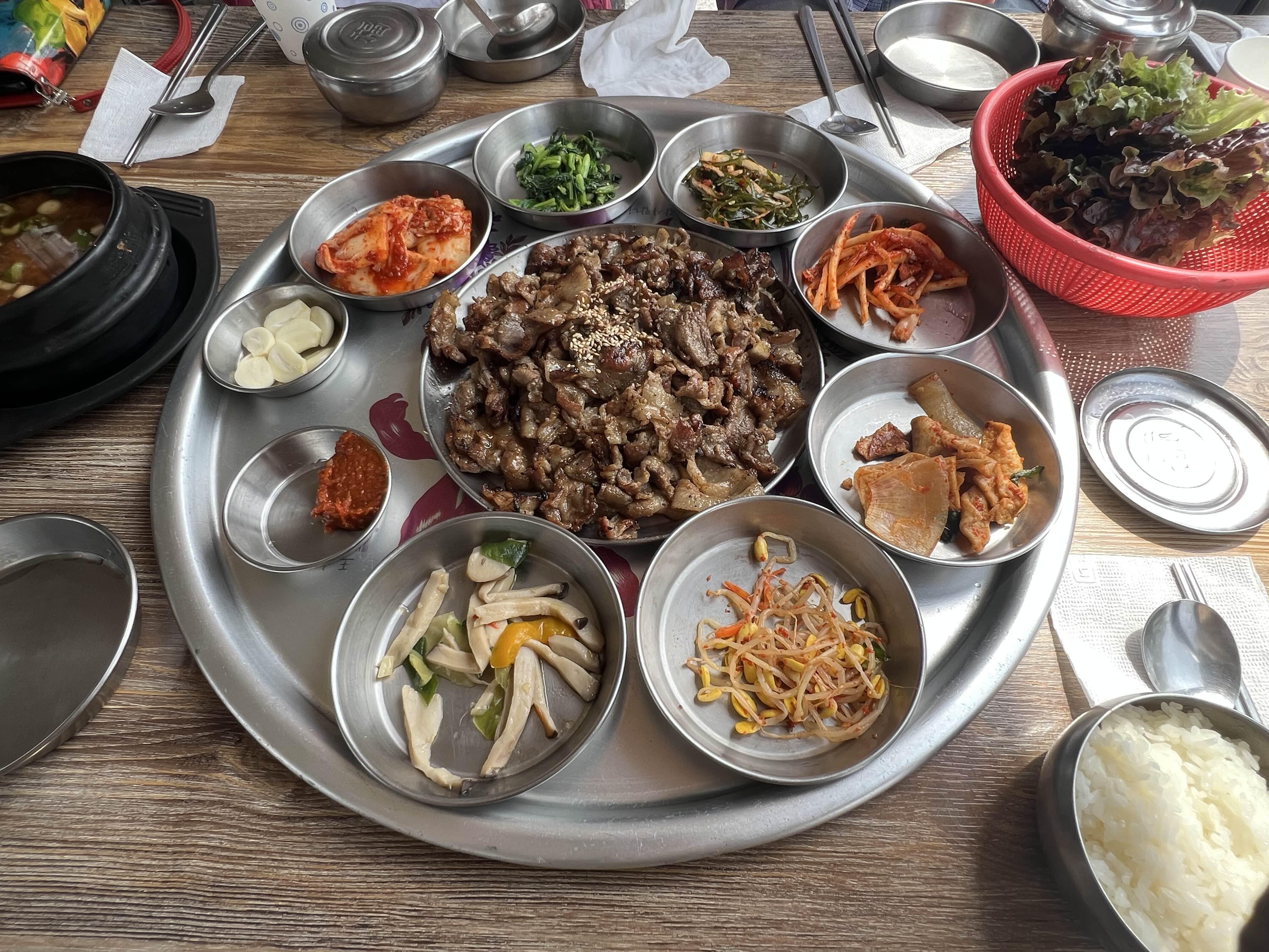 찌개까지 나오는 구성으로 된장찌개와 7가지 반찬이 먼저 나오고 좀 기다리다 보니 메인 불고기가 나왔어요.
