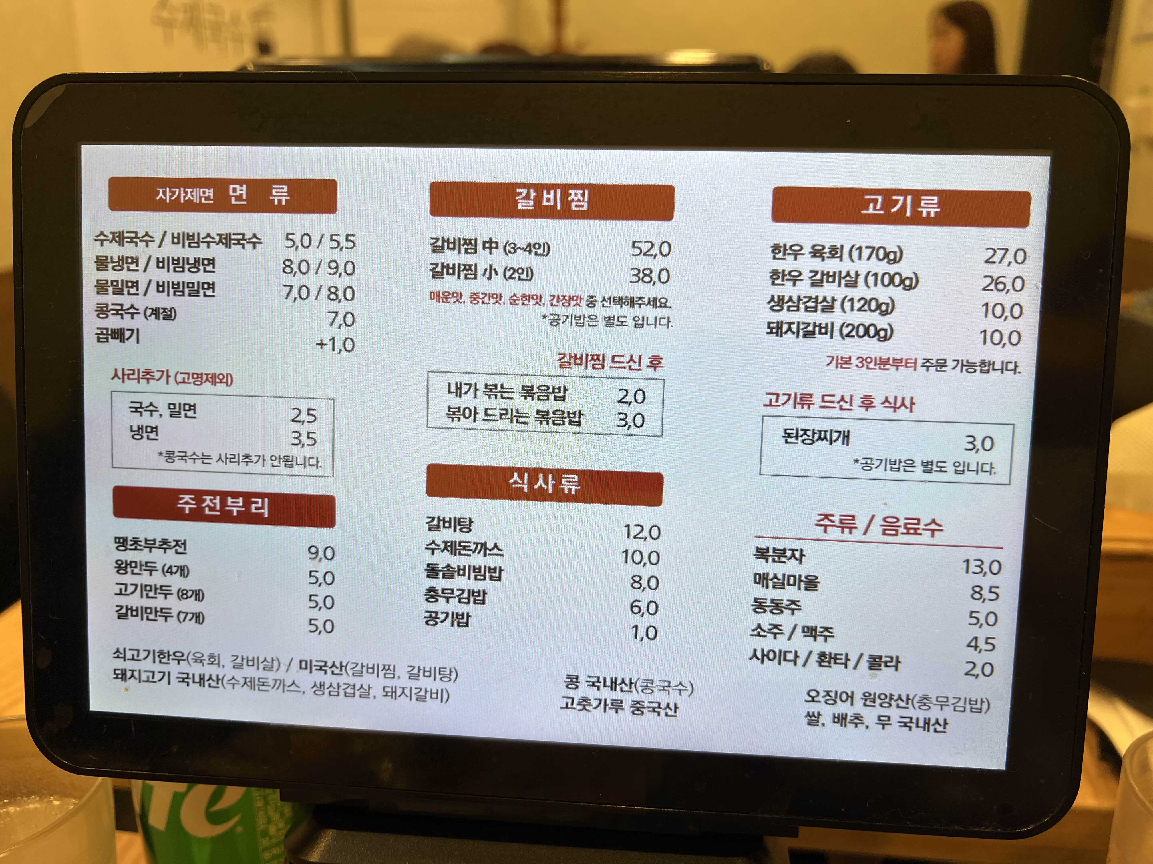 저희는 성인4명이고 식용 왕성한 남동생도 있어서 갈비찜(3~4인용) 하나에 각각 수제국수2, 비빔수제국수1, 물냉면1 이렇게 시켰어요. 사실 가격이 가격인지라 양이 많이 없을거라 생각하고 1사람당 면요리 하나씩 한거였는데 미리 말씀 드리지만 면류만 드실거라면 1인에 면 하나씩이 맞고 갈비찜과 함께라면 면류는 하나씩 덜 시키시는 것을 추천합니다.